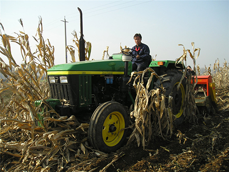 該機(jī)可以再也米稈直立地、秸稈還田地、小麥高茬浮稈地、深翻地等不同前茬條件下,一次性完成滅茬稈、開溝、播種、施肥、覆土、鎮(zhèn)壓等多道工藝。配置指甲式的玉米精量排種器與勺式的相比在同一質(zhì)量下由每小時前進(jìn)5km提高到8km。底盤采用變速旋耕機(jī),可根據(jù)拖拉機(jī)不通的前進(jìn)速度和當(dāng)?shù)氐霓r(nóng)藝要求、土質(zhì)差別,靈活變換三種刀軸轉(zhuǎn)速,徹底解決了拖拉機(jī)跑的快效果差,跑的慢了效益差的問題。