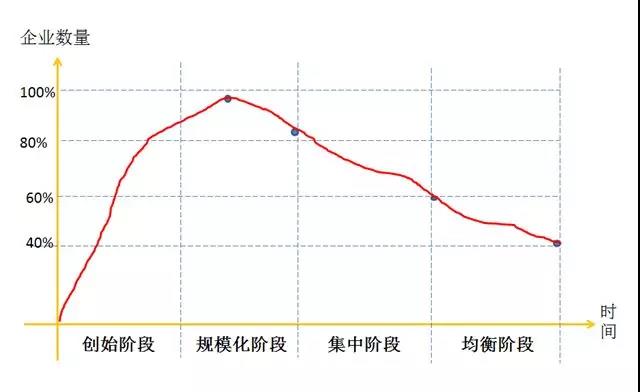 在一個行業(yè),從長期看,企業(yè)要存活下來就要有超出平均水平的成本控制能力。管理學(xué)家陳春花認(rèn)為一個行業(yè)內(nèi)企業(yè)數(shù)量和時間軸之間的關(guān)系可以通過四個發(fā)展階段來說明:初創(chuàng)階段、規(guī)?;A段企業(yè)數(shù)量一直上升,規(guī)模化后期企業(yè)數(shù)量達(dá)到頂峰,開始有擠出效應(yīng),約20%企業(yè)出局,到集中階段又有20%企業(yè)出局,到均衡階段還要淘汰20%,最后的競爭就在剩下的40%企業(yè)之間展開。